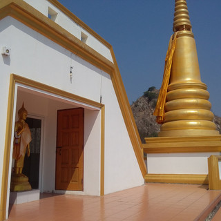 Depuis la route principale, mon regard est attiré par ce grand bouddha au pied d'une montagne. C'est l'histoire d'un moine qui venait souvent méditer sur cette montagne. Un jour, il a reçu l'illumination de construire un temple à cette endroit. Voilà que le Wat Tham Phrathat Khao Prang sort de terre grâce à des dons et offrandes diverses.